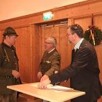 Es gab aber noch weitere Urkunden zu überreichen: an unsere erfolgreichen Jagdschüler. Dieses Jahr wollten wir allerdings ein Freisprechung abhalten, nicht nur eine Übergabe des wunderschönen Jägerbriefes. Daher schworen die Jungjäger auf die korrekte Ausübung des Waidwerks und wurden anschließend einzeln von unserem Gildemeister per Jägerschlag in den Kreis der Waidgenossen aufgenommen.
